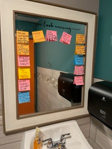 I started my joyful journey by getting a packet of post-it notes and writing out on each one some inspiring messages. I kept them on me and when I was out in random locations (Restaurant, Cafe, Library, Church, grocery store, etc.) I put a post-it note up to be left behind for people as encouragement. I did this for about two weeks and then it started to get into my head that it was a silly concept. I thought it really wasn’t having an impact. I went back to the café where I had previously put a post-it note up on the mirror in the bathroom. I put my order in at the counter and I went into the bathroom to put up another post-it note. While I was walking to the bathroom, I was talking to God in my head saying this is so silly. Why am I wasting my time putting these post-it notes up everywhere? It doesn’t really mean anything. When I opened up the door, I saw the mirror where I placed one post-it note to discover many post-it notes were now up by my original with inspirational quotes and sayings on them. I literally laughed out loud and teared up – clearly God was showing me no act is too small to make an impact and encourage others to spread joy. I had known this to be true in the past, but my Father knew I needed some encouragement, and He is always so faithful and on time. I shared this story with several of my friends, and they started sprinkling joy and sent pictures to me of their acts of encouragement.